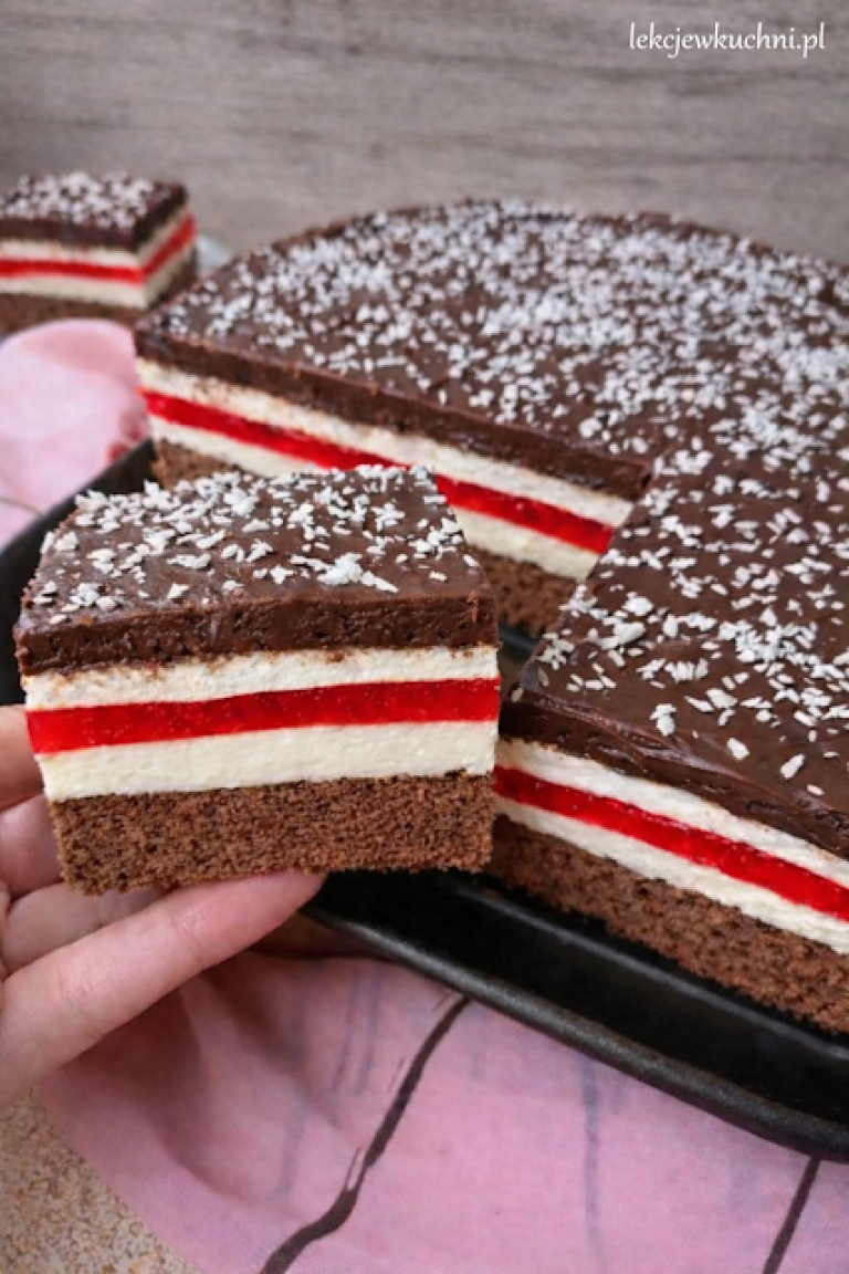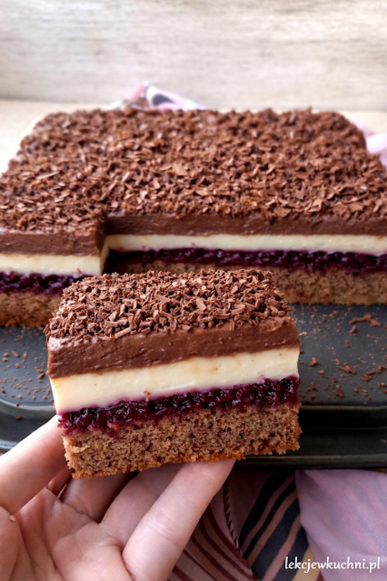Ciasto Czekoladowa Gratka z kremem budyniowym i galaretką to deser, który łączy w sobie klasyczne smaki i bardzo efektowny wygląd ...