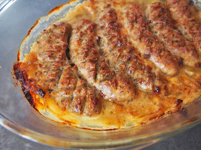 Biała kiełbasa zapiekana w sosie chrzanowo-jogurtowym
