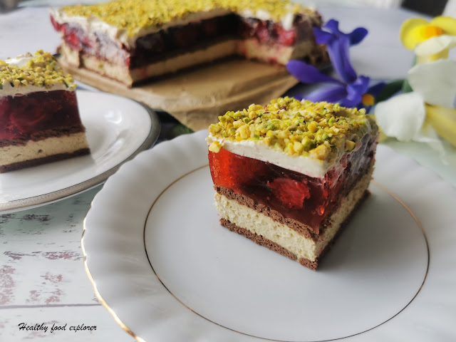 Ciasto bez pieczenia z kremem pistacjowym, galaretką i truskawkami