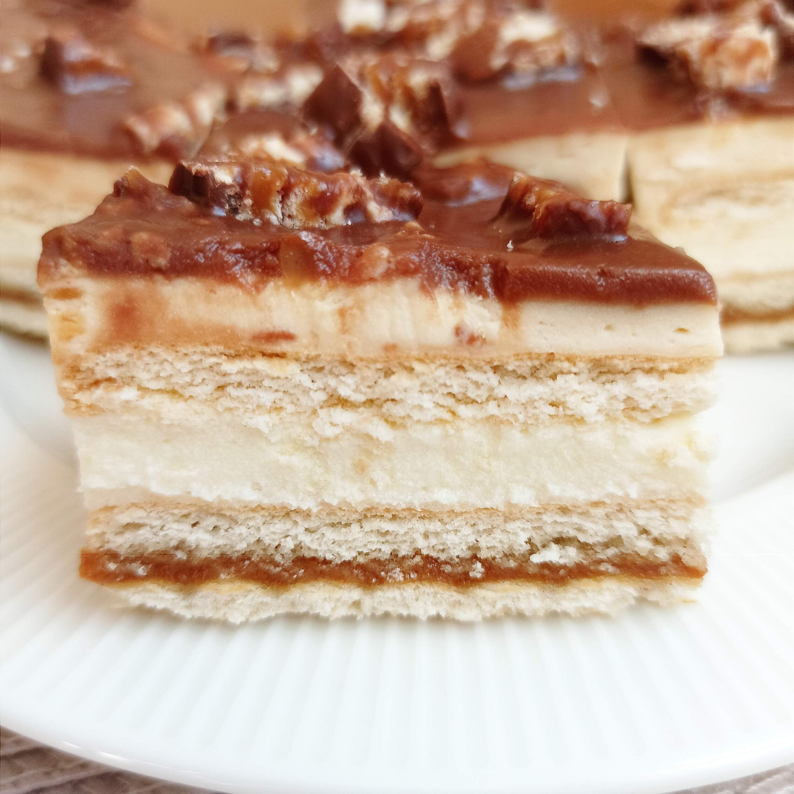 Lekkie, kremowe ciasto bez pieczenia na herbatnikach z kajmakiem, masą budyniową o…