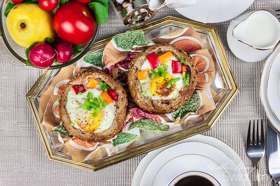 Dziś propozycja na niebanalne śniadanie:) Niby zwykłe jajko, niby zwykła bułka… Ale kiedy wydrążycie środek bułki, posypiecie go serem, posiekaną szynką, wbijecie na to świeże jajko, udekorujecie kawałeczkami kolorowej papryki lub pomidorkami koktajlowymi i zapieczecie w piekarniku na złoty kolor powstanie Wam przepyszna, chrupiąca i kolorowa zapiekanka z
