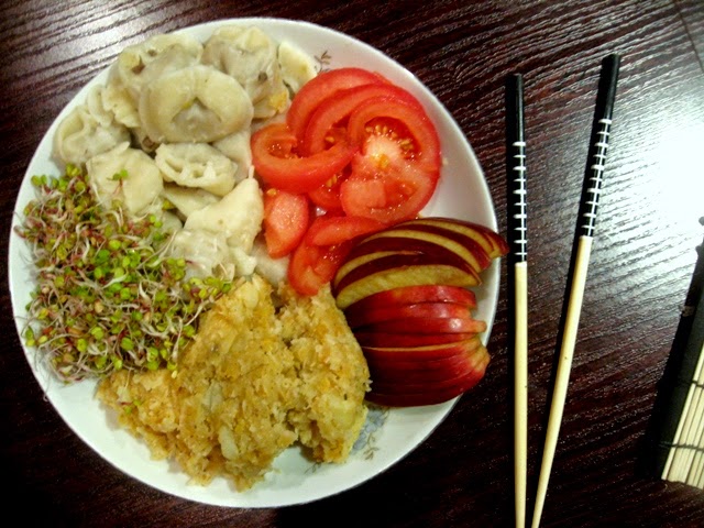 Trochę mnie czas pogonił, ale trzeba było zjeść coś w miarę porządnego. Łapnąłem zatem z lodówki wczorajsze ziemniaki i zmieszałem z ugotowaną czerwoną soczewicą. Do tego doszło trochę kupnych uszek z kapustą i grzybami, jabłka i pomidory. Trochę kiełków rzodkiewki i mamy cały obiad. Smacznie, szybko, zdrowo (bez smażenia) i