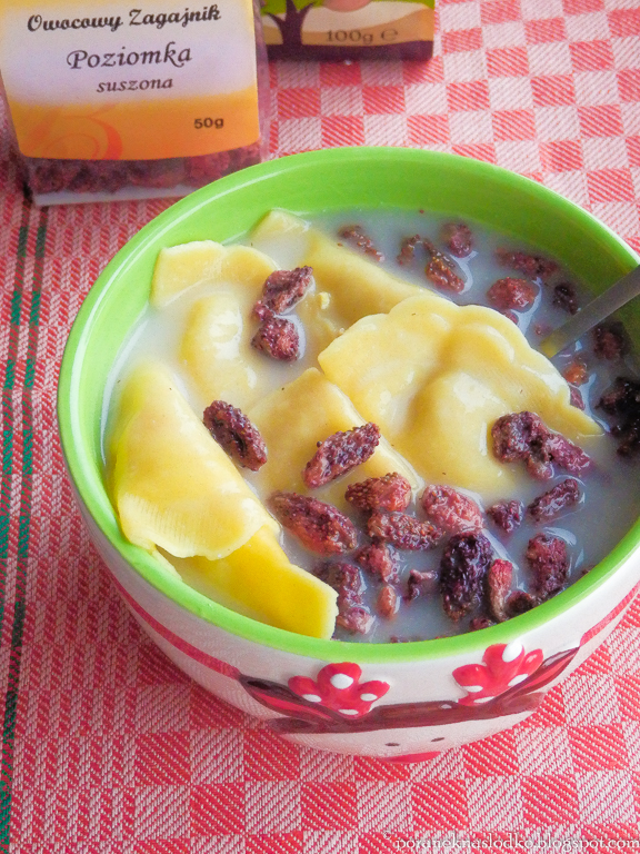 Pierożki z semoliny nadziane ekologicznymi migdałami podane z suszonymi poziomkami i napojem kokosowo-ryżowym