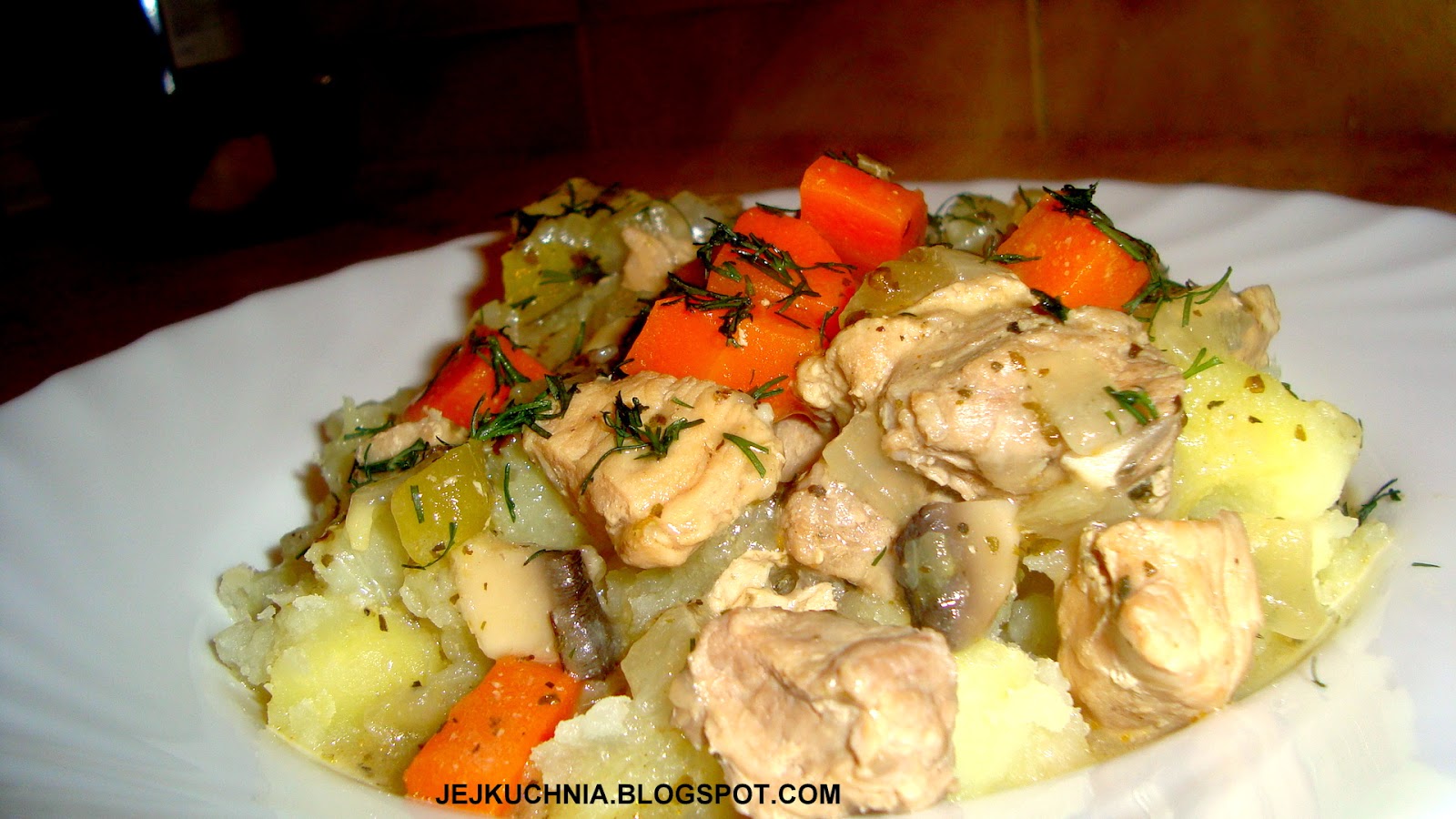 Składniki:Około 1,5 kg mięsa z szynki,2 średnie ogórki kiszone,5 dużych cebul,duża marchewka,20 dag pieczarek,2 łyżki oliwy,łyżka sosu sojowego,2 średnie