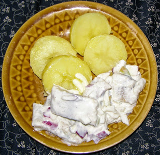 ziemniaki „sałatkowe” gotowane w mundurkach 1 kg, masło zimne 1/4 kostki, sól – do smaku, płaty śledziowe 8 sztuk,