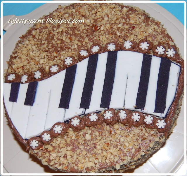 Tort z kremem kakaowym i klawiszami z masy cukrowej (lukru plastycznego)