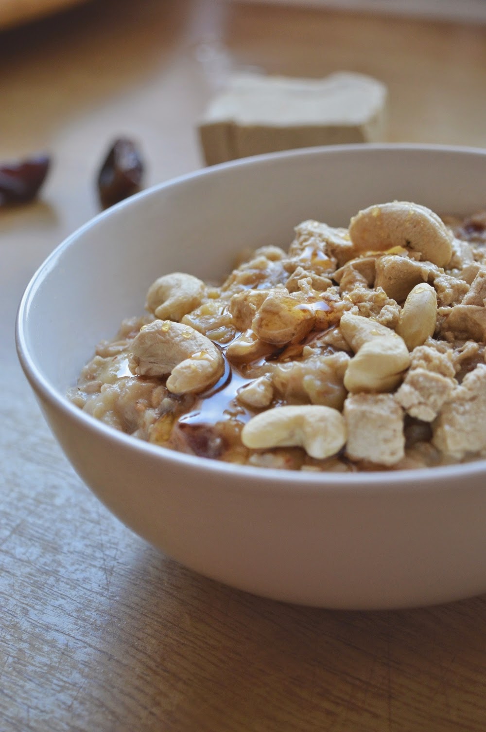 owsiany ulepek z bananem, daktylami, szafranem, chałwą, nerkowcami i syropem z pędów sosny