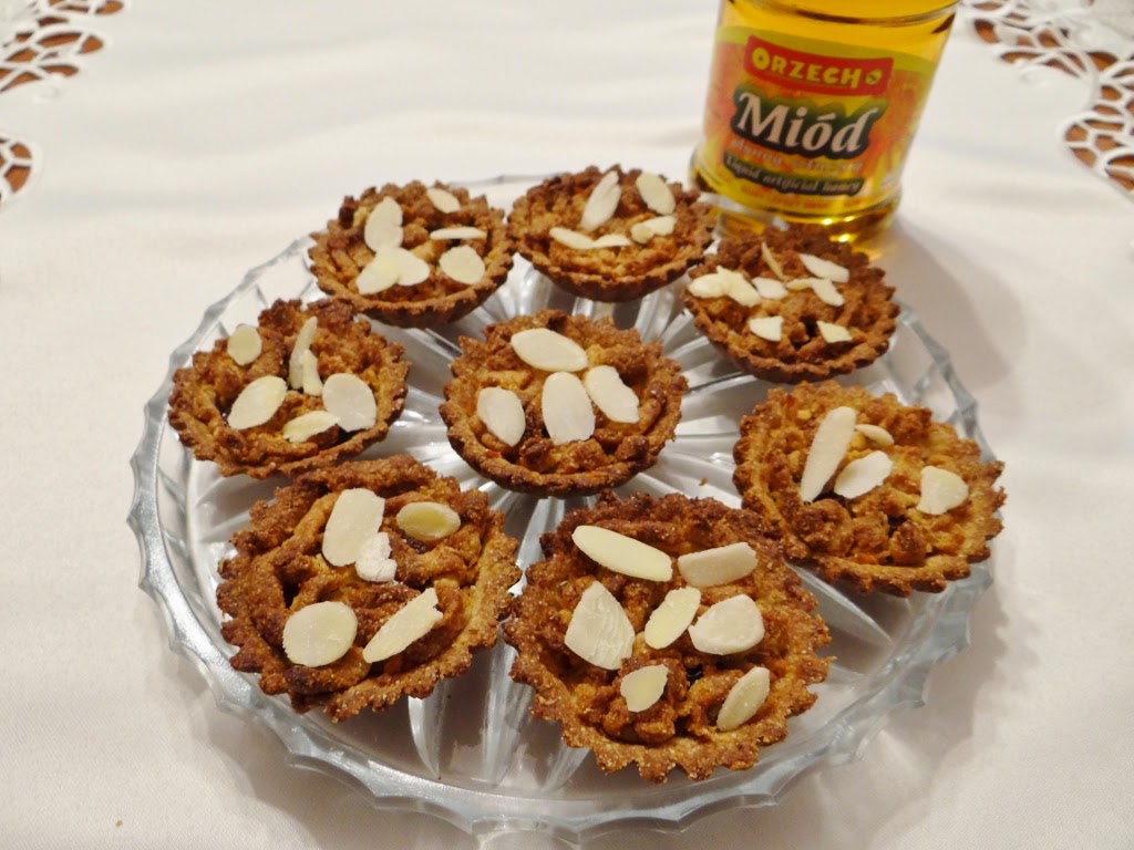 1 szkl mąki orkiszowej2 żółtka10 dag masła1 łyżka zimnej wody1 łyżeczka miodu Orzech1 duże jabłko1/2 łyżeczki cynamonurodzynkiwiórki kokosowe