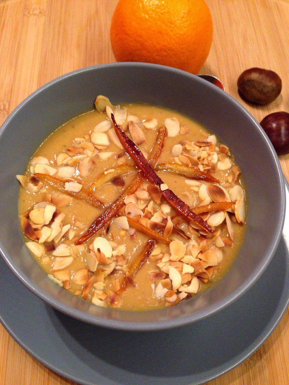 ok.600 gr. kasztanów jadalnych mała dynia mleko migdałowe woda lub bulion warzywny sól, pieprz oregano, imbir, kurkumasok z połowy pomarańczy płatki migdałoweskórka z pomarańczy olej rzepakowy