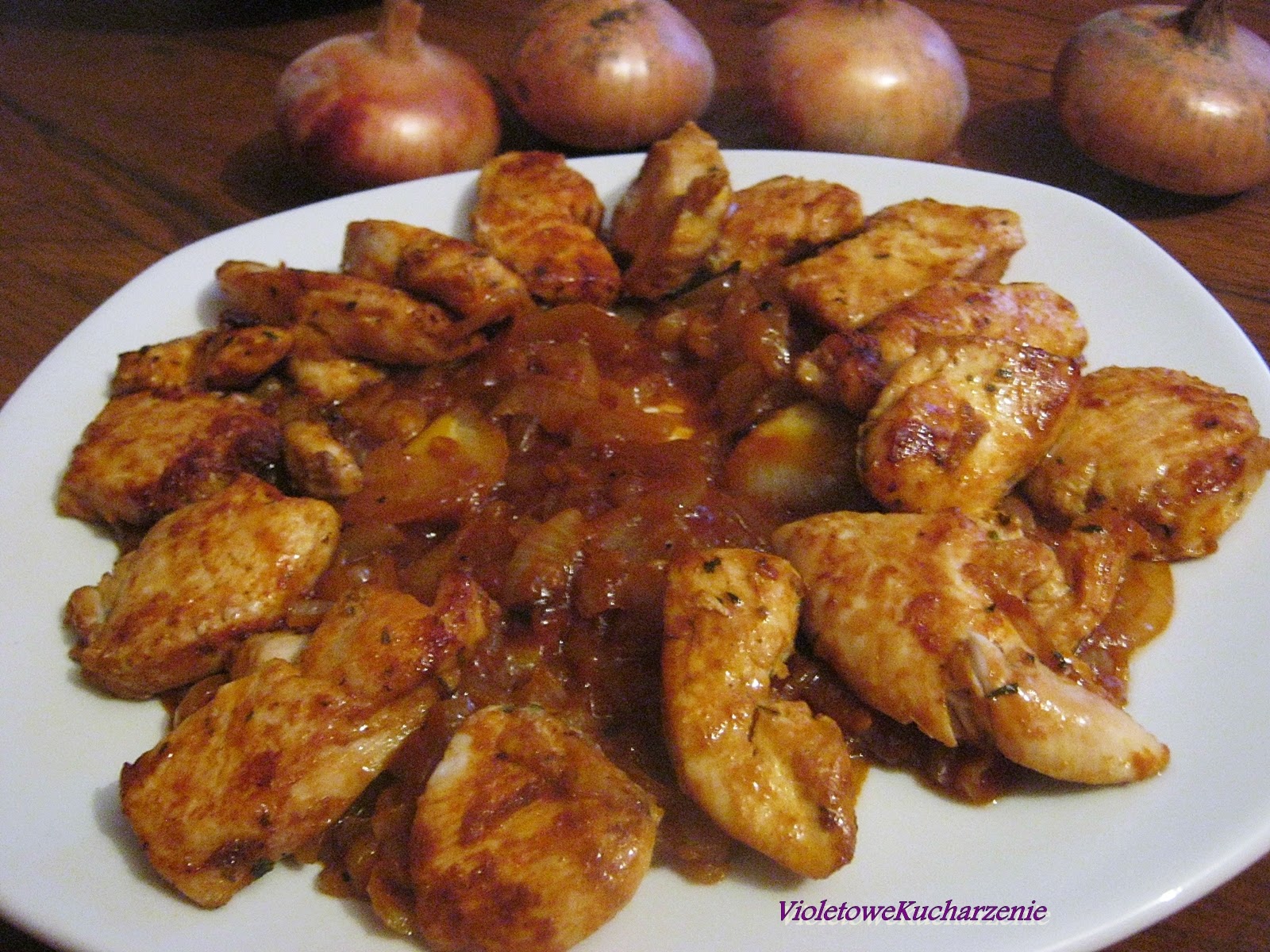 Pikantne i świetne połączenie filecików z kurczaka z białą cebulą w keczupowym sosie. Nam bardzo smakowało!