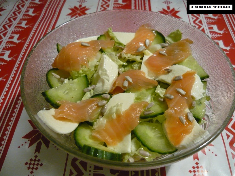 Karnawał pełną parą się zaczął już parę dni temu więc tak jak obiecałem będą sałatki!. Tym razem sałatka lekka a zarazem pożywna i aromatyczna. Wędzony łosoś norweski, mozzarella, pekińska, ogórek, pestki słonecznika i dressing limonkowy na bazie oleju ryżowego. Sałatka szybka, pełna witamin i czekająca wręcz na przyrządzenie. Dressing polecam
