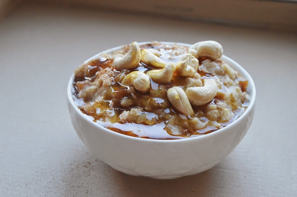 owsianka z bananem, suszonymi na słońcu morelami, nerkowcami, cynamonem i miodem kasztanowym
