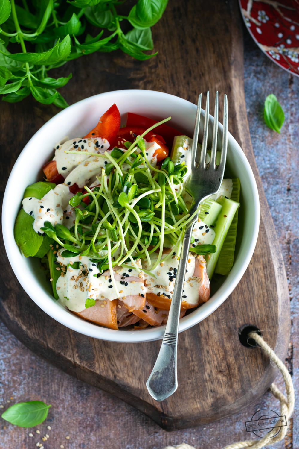 Jednoporcjowa miseczka śniadaniowa. Pełna warzyw, wędzonego na gorąco łososia oraz dodatku majonezowo-śmietanowego…