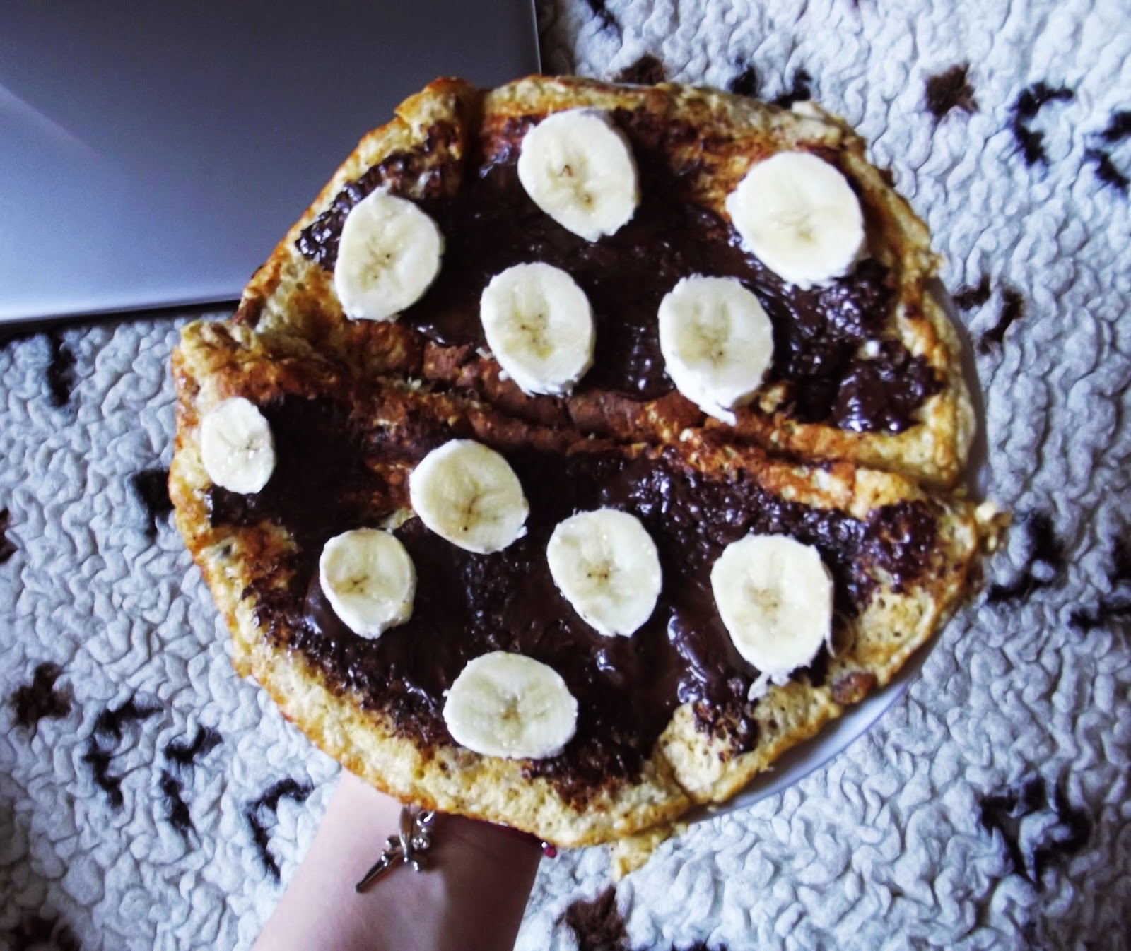 piernikowy owsiany naleśnik z orzeszkami sojowymi, roztopioną gorzką czekoladą i bananem