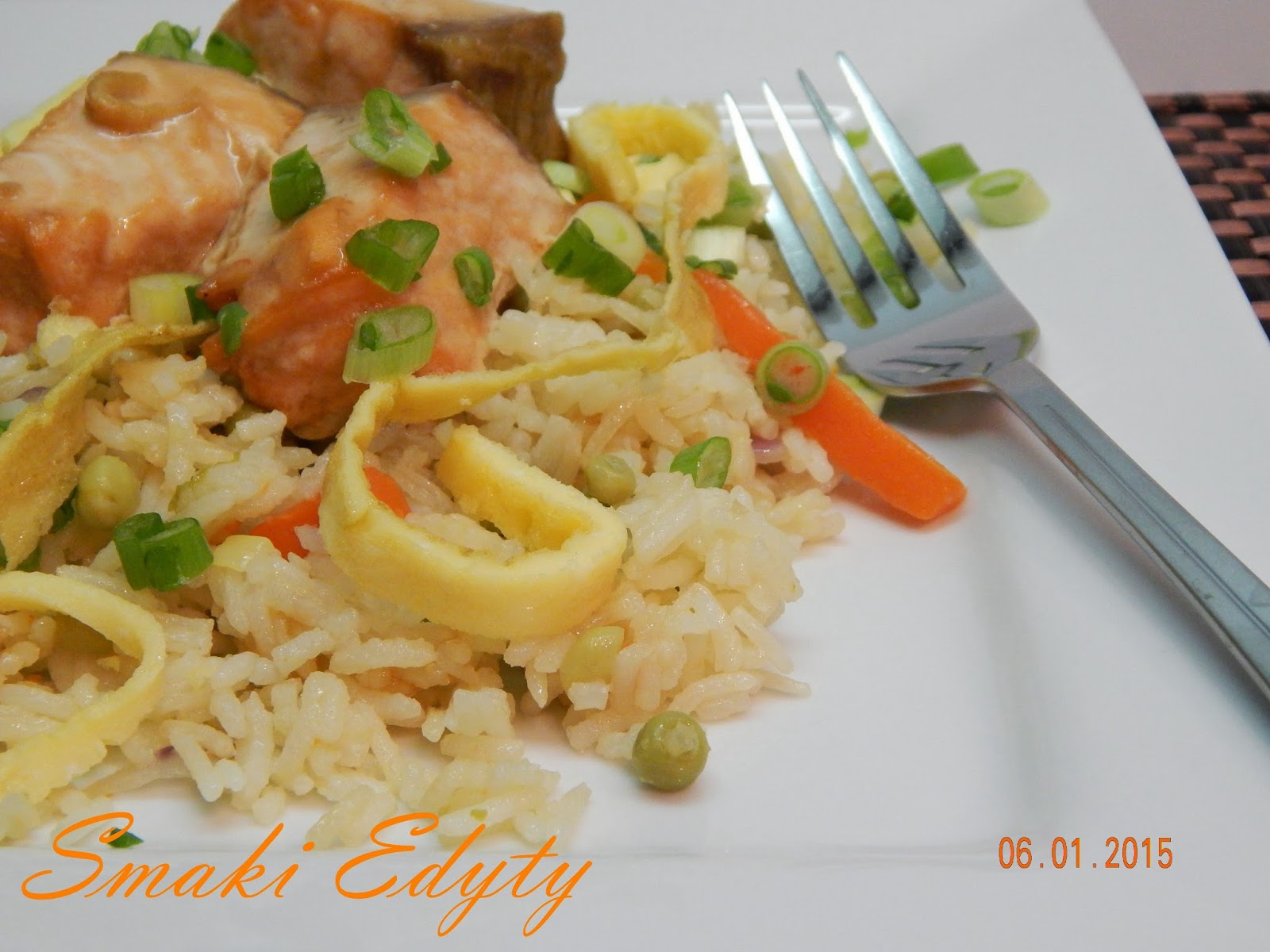 Przepyszny obiad- ryż smażony po chińsku, delikatny i niebiański w smaku. Możemy do ryżu dodać zblanszowany brokuł, szparagi lub fasolkę. Każde warzywo na które mamy ochotę. O walorach łososia , nie muszę Was zapewniać, ale ten sposób przyprawiania i pieczenia- polecam w szczególności- łosoś jest delikatny i rozpływający się w
