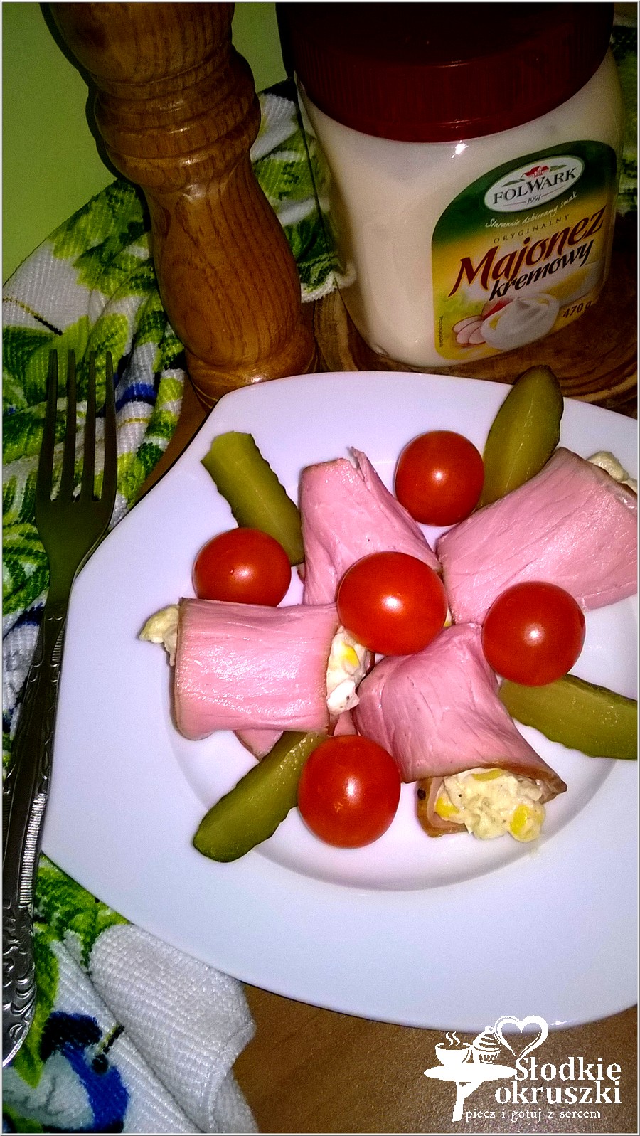 Sałatka podana w wędlinie z pomidorkami i ogórkiem