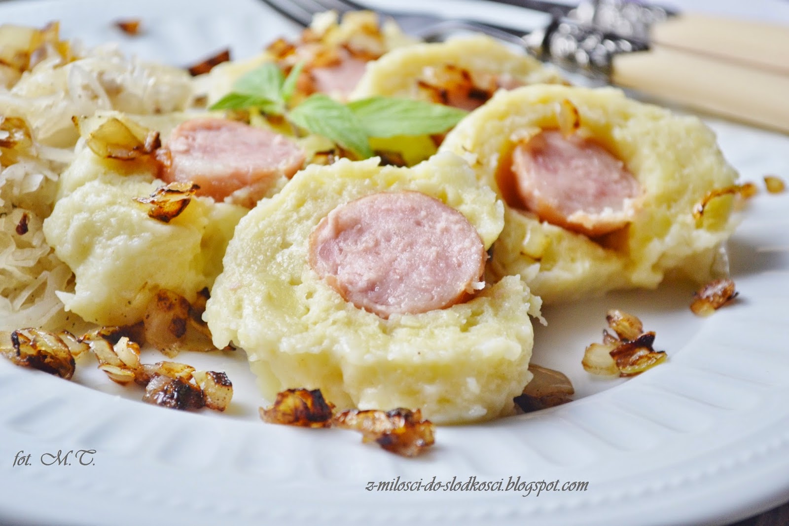 Knedle ziemniaczane z kiełbasą i kiszoną kapustą
