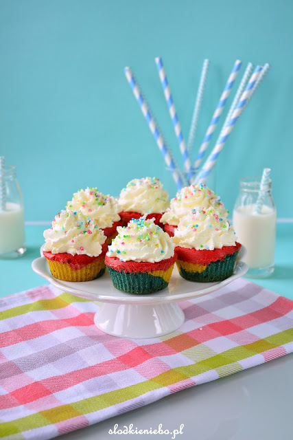 Kolorowe muffinki z bitą śmietaną i kolorową posypką