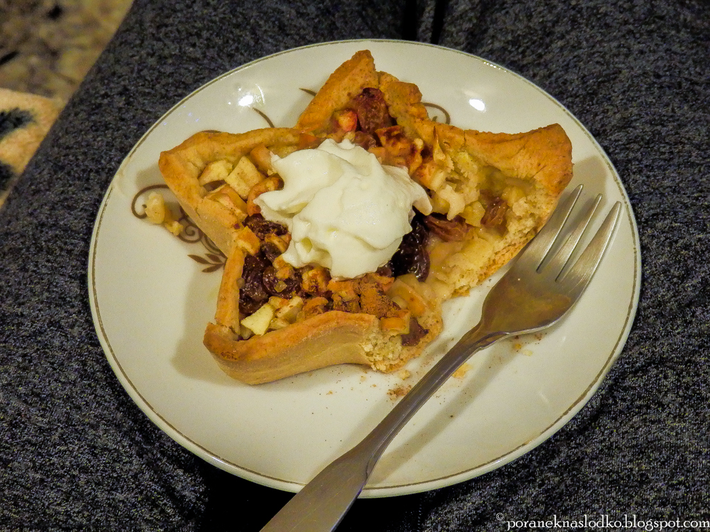 Piernikowa tartaletka z jabłkami, organicznymi rodzynkami (Crazy Jack) i bitą śmietaną