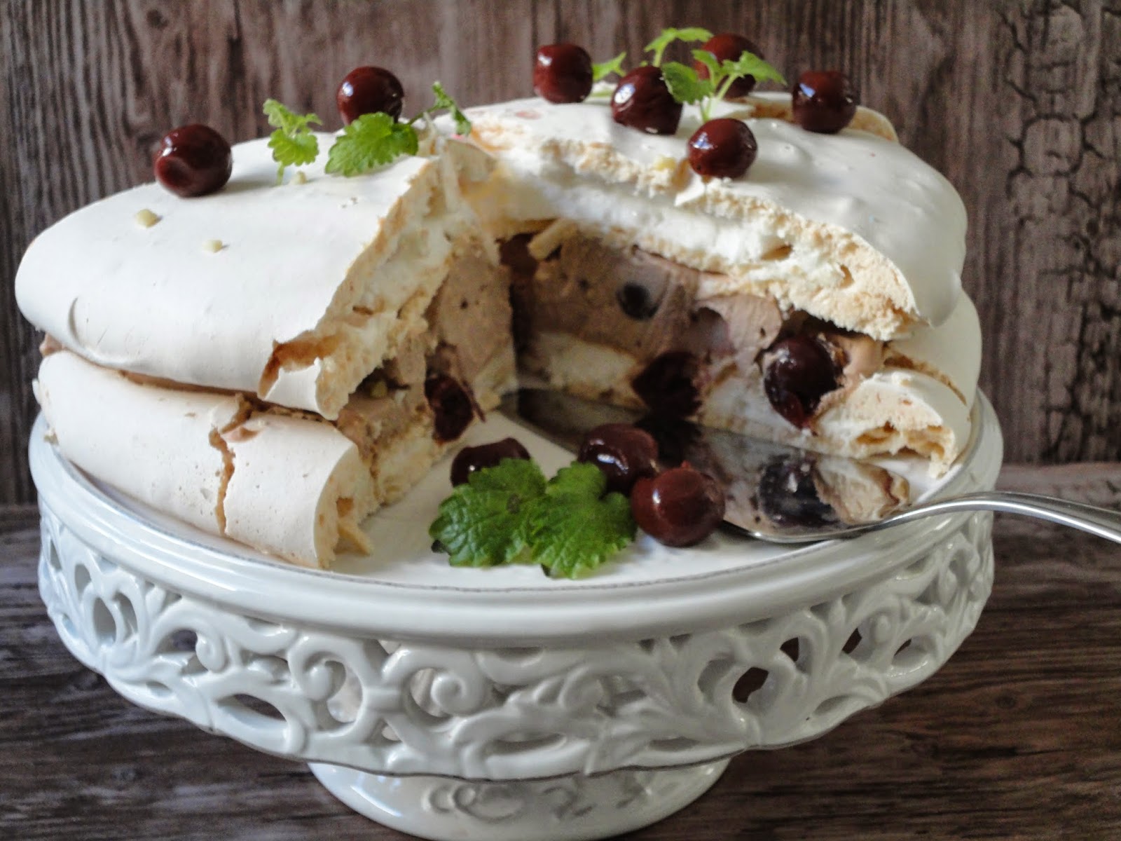 Przepyszny tort bezowy z kremowym i puszystym musem czekoladowym, wiśniami w alkoholu i wspaniale kontrastującymi chrupiącymi orzechami.