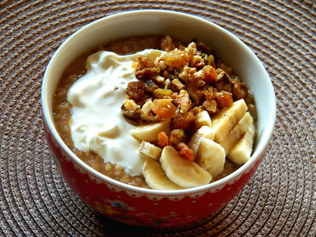 kasza jęczmienna z bananem, twarożkiem, orzechami włoskimi, rodzynkami, miodem i cynamonembarley with…