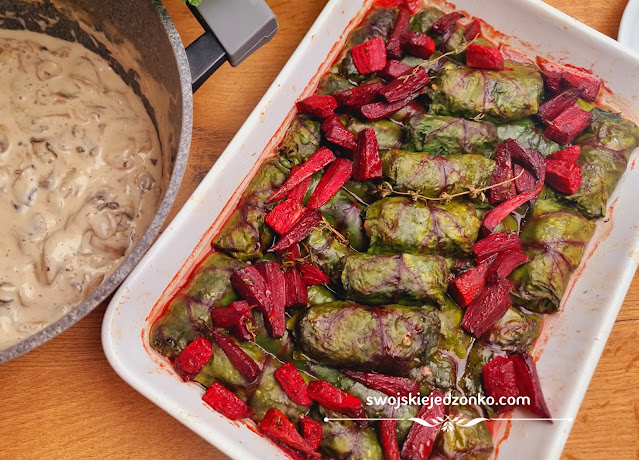 Mini gołąbki w liściach botwinki + sos