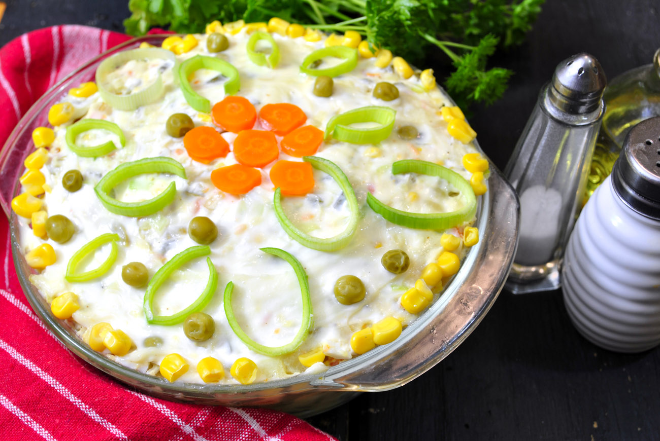 Sałatka dość szybka . Przygotujemy na pewno dla niespodziewanych gości. Wystarczy mieć w domu kilka składników.