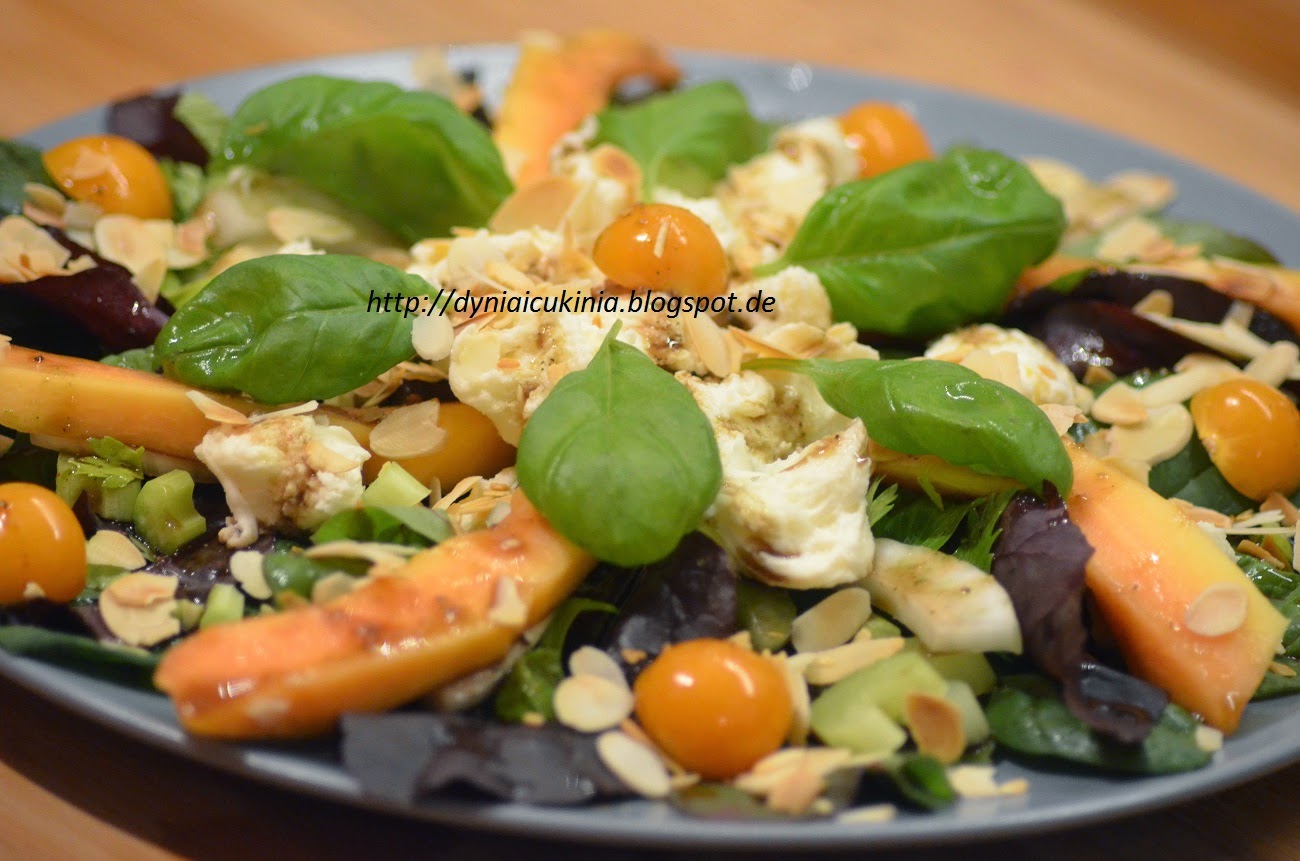 200gr listków młodego szpinaku 200gr listków młodej botwinki połówka papai kilka owoców miechunki dwie gałązki selera naciowego połówka kopru włoskiego 1 mozarella 200 gr. dwie garście prażonych migdałów do dekoracji listki świeżej bazylii