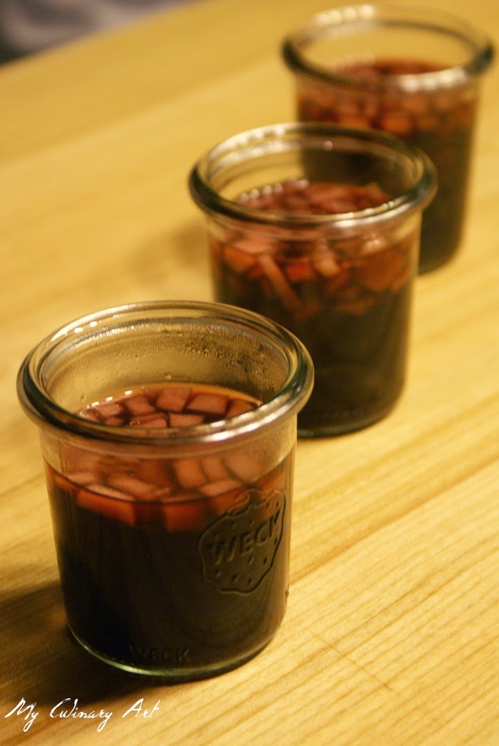 Przygotowanie: Jabłko i pomarańczę obieramy. Jabłko kroimy w drobną kostkę, a pomarańczę filetujemy. Wszystkie składniki umieszczamy w garnuszku, mieszamy i