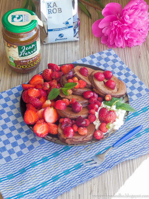 Karobowe (Naturo.pl) białkowe* pancakes z dodatkiem kremu czekoladowo-orzechowego (Jean Herve) podane z…