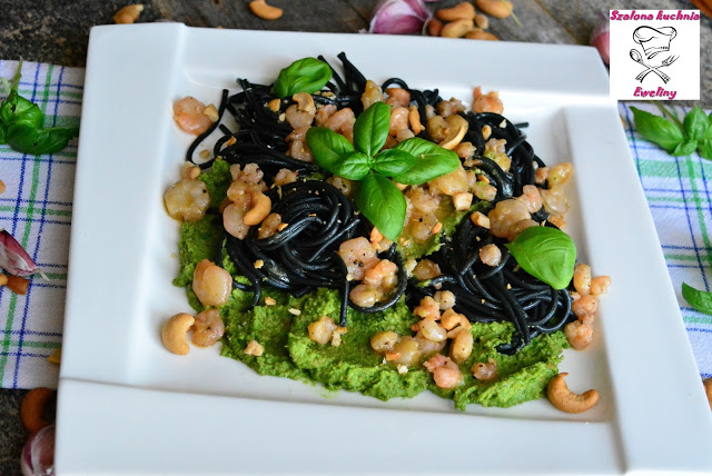 Spaghetti z bazyliowym pesto i krewetkami