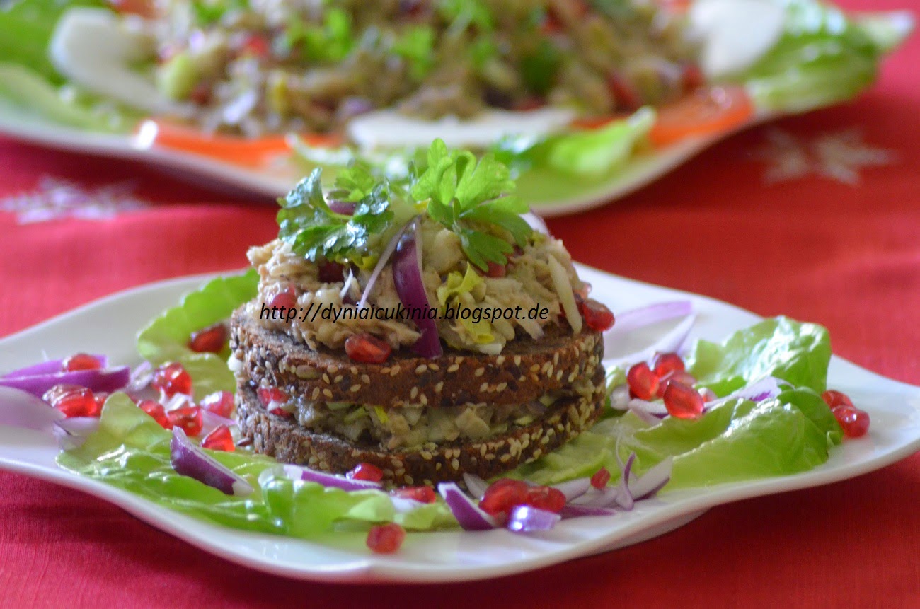 puszka tuńczyka w sosie własnym gruszka nashipół awokado 1 gałązka selera naciowego pół małego kopru włoskiego pół czerwonej cebulki drobno pokrojonej garść pestek granatu ( słodka odmiana )sok z cytryny do smaku sól, pieprz do smaku garść płatków migdałowych odrobina oleju lnianego