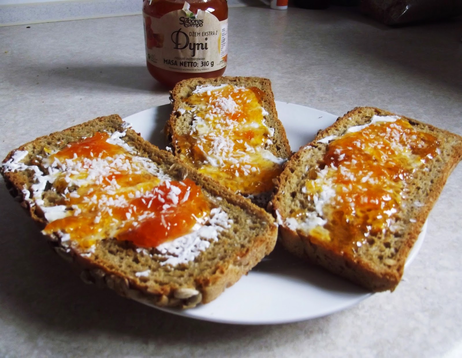 grzanki z chleba żytniego ze słonecznikiem, serkiem śmietankowym, dżemem z dynią i…