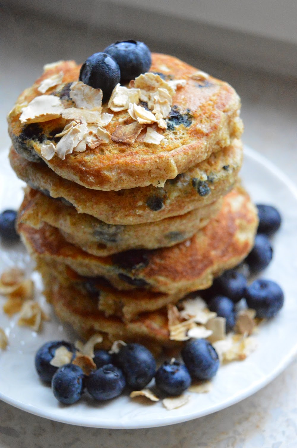 jogurtowe kokosowe* placki z borówkami, płatkami kasztanowymi i syropem klonowym*na mące kokosowej, smażone na oleju kokosowym