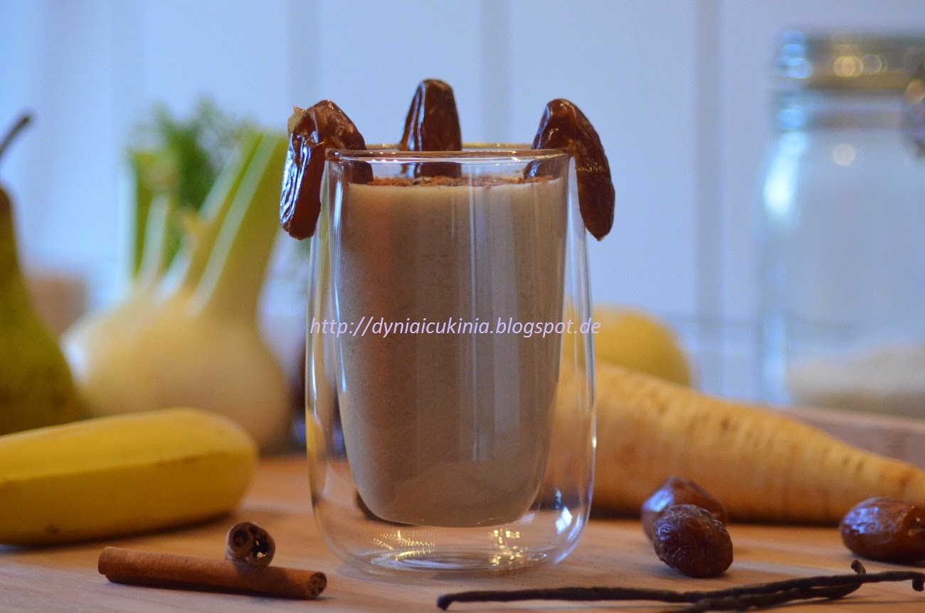 pół kopru włoskiego 3 pietruszki 3 gruszki 1 jabłko 1 nashi ( gruszka chińska )1 banan olej kokosowy śmietanka kokosowasyrop klonowy szczypta wanilii i cynamonu daktyle do dekoracji