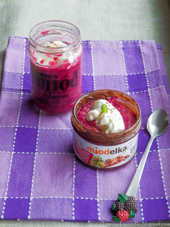 Buraczana owsianka na napoju sojowym Alpro bez cukru podana z mascarpone w słoiczkach po miodelce i miodzie akacjowym