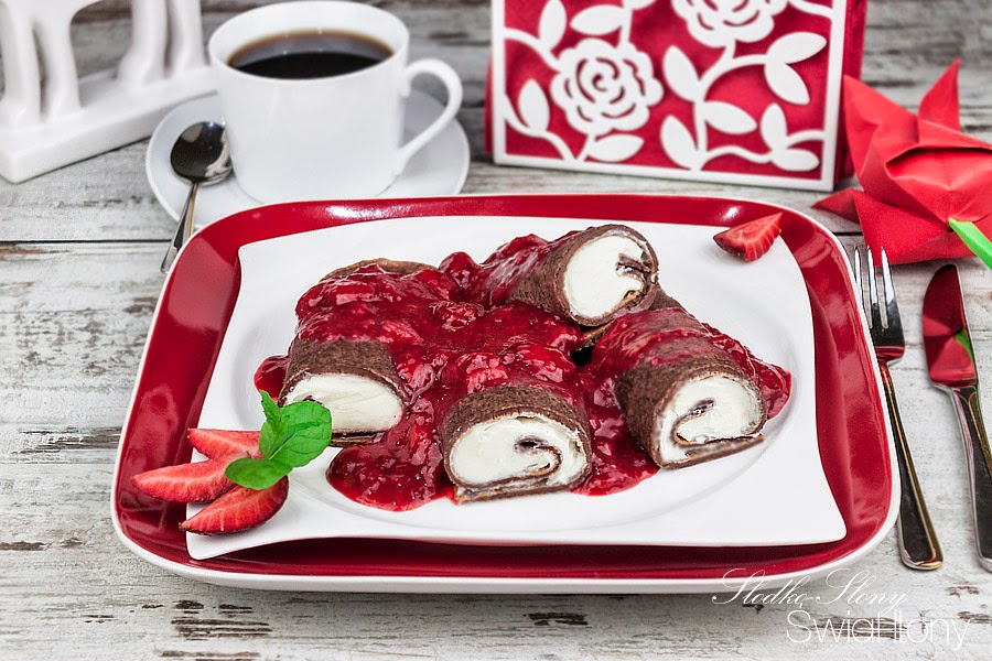 Wzięło mnie coś ostatnio na tiramisu i tak oto powstała kolejna jego wariacja:) Naleśniki tiramisu: mocno czekoladowe z delikatnym kremem z mascarpone i waniliowego serka homogenizowanego oraz odrobiny kawy oraz brandy (amaretto jakimś cudem wyparowało mi z butelki!:D). Do tego mnóstwo pysznego sosu truskawkowego, który zrobiłam