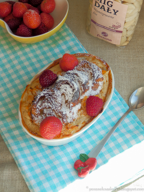 Kremówkowy pudding z croissanta z blanszowanymi migdałami bio (Fresano) i dynią podany z truskawkami, malinami i cukrem pudrem trzcinowym