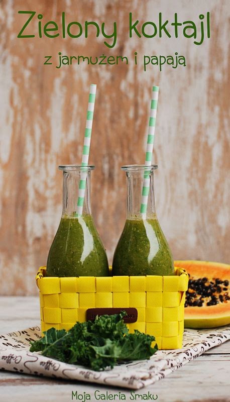Składniki do tego koktajlu tj, jarmuż i papaję wypatrzyłam w Biedronce 🙂 Jarmuż jest już mi znany, natomiast papaję miałam okazję spróbować po raz pierwszy. Ma ona słodki, lekko korzenny smak. Co ciekawe pestki papai również można jeść (oprócz kobiet w ciąży), mają one ostry i wyrazisty smak, dlatego