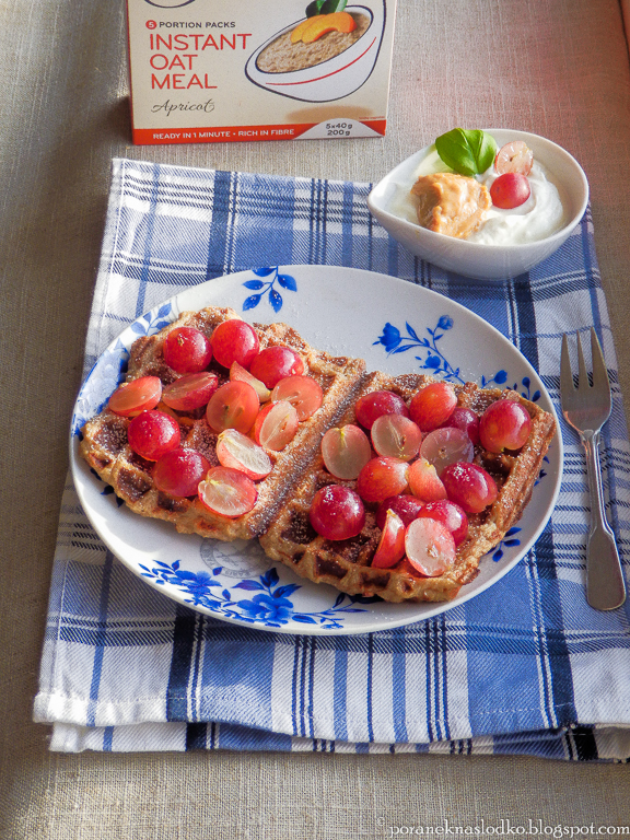 Karmelowo-rumowe gofry z bezglutenowych płatków owsianych z morelami podane z cukrem pudrem trzcinowym, różowymi winogronami, kremem karmelowym i mascarpone