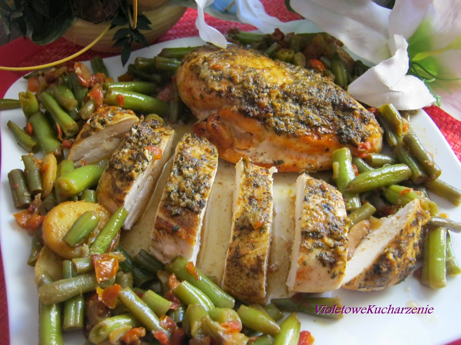 800 g filetu z piersi kurczaka3 ząbki czosnkuPrzyprawa do kurczaka2 łyżki oliwy z oliwek3 łyżki soku z cytryny0,5 łyżeczki imbiru0,5 łyżeczki cząbru0,5 łyżeczki słodkiej papryki0,5 łyżeczki lubczyku0,5