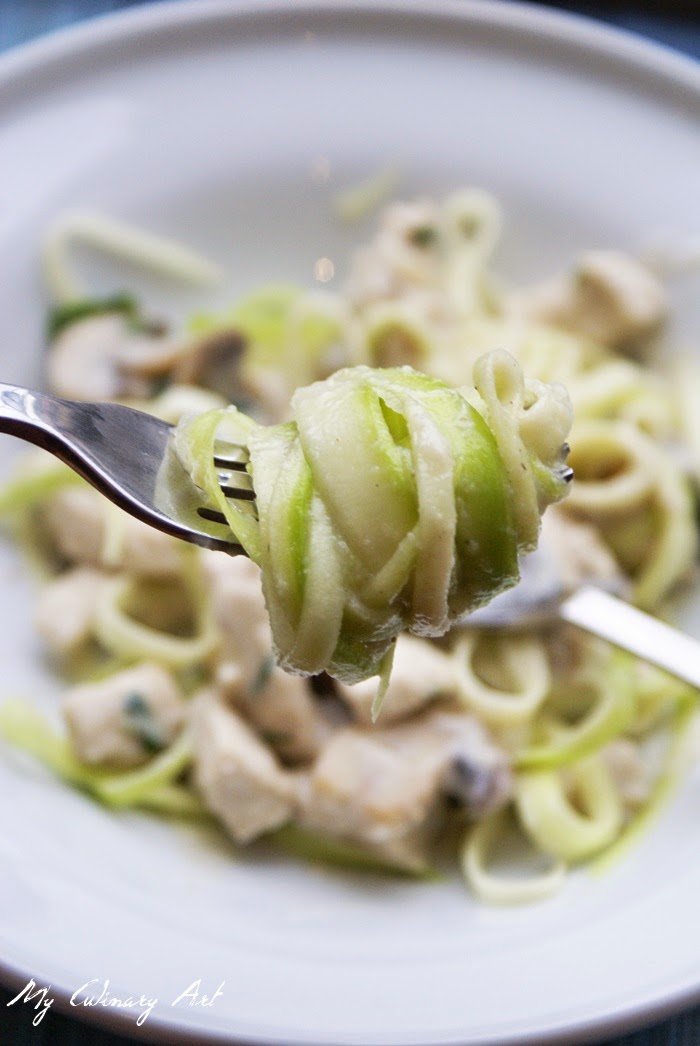 Ciekawe wykorzystanie cukinii oraz kalafiora. Potrawa jest lekka i delikatna, a dodatkowo bezglutenowa i bardzo szybka w przygotowaniu. Kurczaka można zastąpić krewetkami.