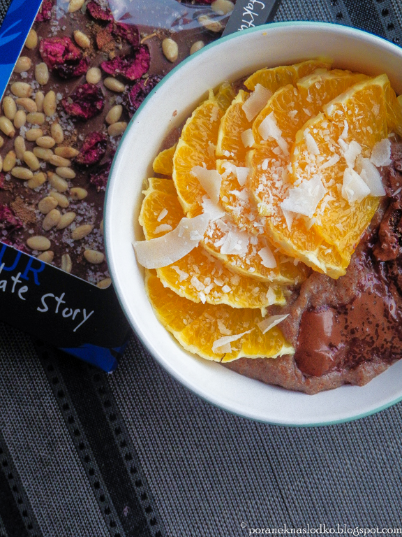 Płatki teff na mleku migdałowym podane z pomarańczą, płatkami kokosa i czekoladą „Your chocolate story” z wiśniami, orzeszkami pinii, kwiatem soli morskiej i przyprawą do piernika