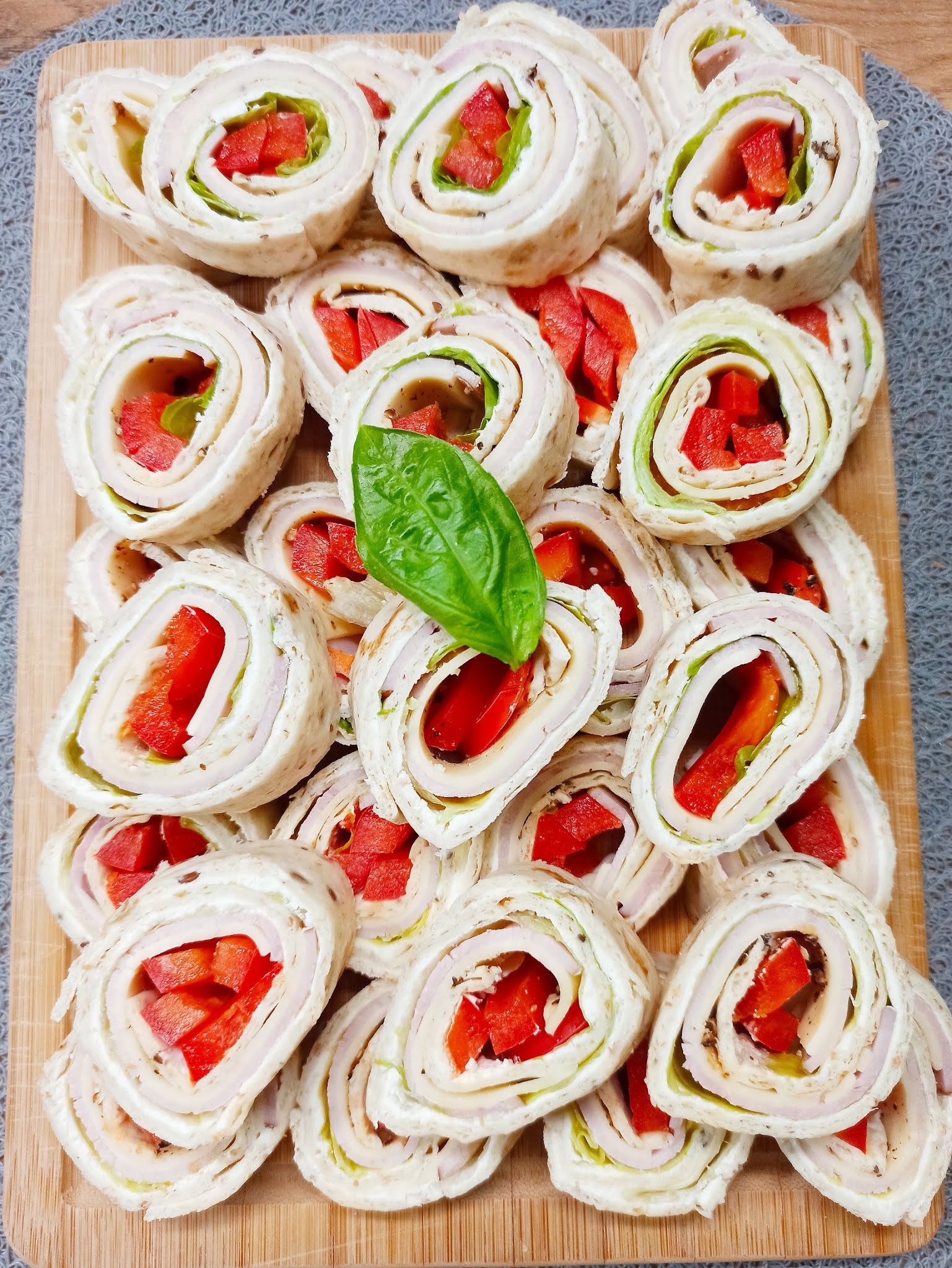Mini roladki z tortilli z pysznymi dodatkami: sałatą, szynką, serem żółtym i…