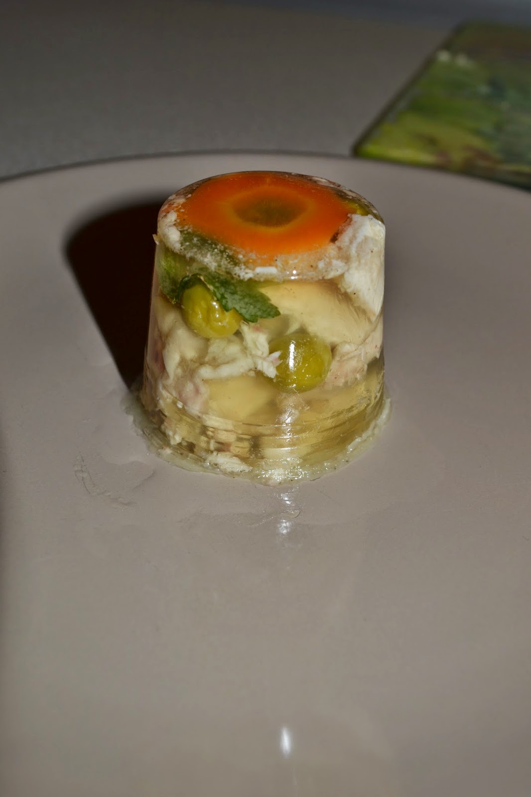 Składniki:1 kg pałeczek z kurczaka5 marchewek2 pietruszkipół selera1 podpalona cebulkagłówka czosnku 2 kostki rosołowe (jedna drobiowa, druga wołowa)2 łyżki przyprawy typu Kucharek sól, pieprz2 opakowanie żelatyny natka pietruszki puszka groszku