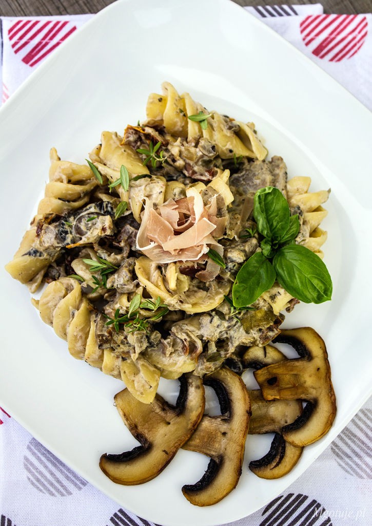 Wpis pochodzi z www.mgotuje.pl Makaron z pieczarkami, szynką szwarcwaldzką i suszonymi pomidorami…