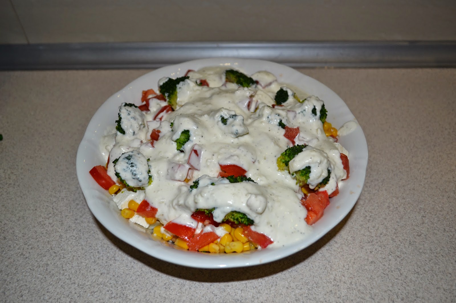 1 brokuł1 opakowanie fety 1 puszka kukurydzy 1 pierś z kurczakaprzyprawa do gyrosa4 jajka2 pomidory czosnek 3 łyżki jogurtu naturalnego 3 łyżki śmietany sól, pieprz