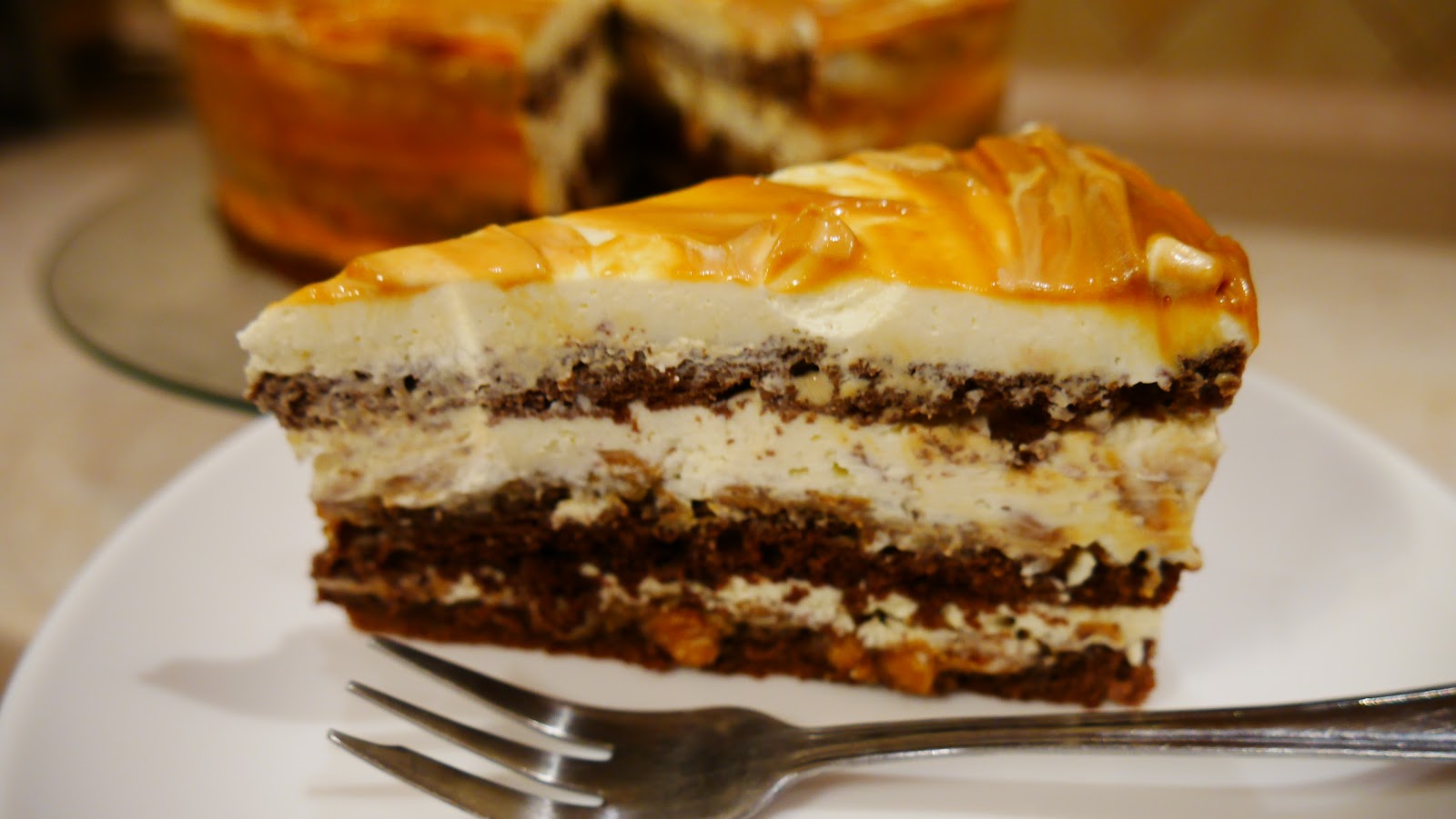 Tort mocno orzechowy i karmelowy z batonikami Snickers. Słodycz tortu przełamuje gorzka…