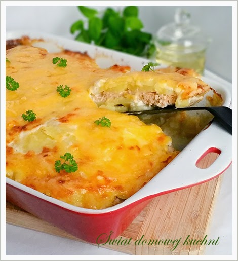 400 g piersi z kurczaka1 opak. Fix Kebab z sosem czosnkowym Knorr1 kg ziemniaków400 ml śmietany 18%200 g startego żółtego sera100 ml zimnej wody