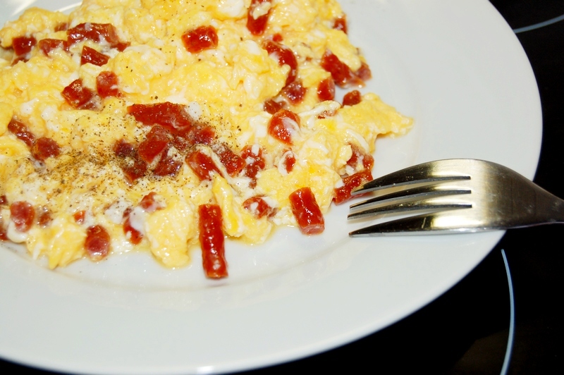 Niedzielne śniadanie z jajecznicą to już tradycja , która jest zakorzeniona w naszej rodzinie od wieków . Jedyna modyfikacja , to czasowa wymiana składników pomocniczych -dodatków , które mogą być ale nie muszą . Fajnie jednak nieco ożywić tą potrawę , tym razem